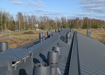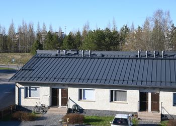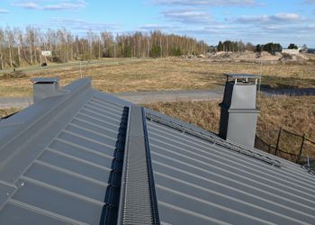 Lukkosaumapelti on ajattoman tyylikäs ja kustannustehokas ratkaisu, kun halutaan kestävä ja helppohoitoinen katto. Kaikki kattoturvatuotteet asennetaan puristuskiinnikkeillä kattoon, joten vesikatteeseen ei tule reikiä. Tässä kohteessa asennettiin lisäksi tulevaa IV-remonttia ajatellen harjalle Vilpe -läpivientisarjat, eli remonttia suunnitellessa otettiin huomioon jo tulevat remontit. Näin haluttiin varmistetaa se, että kattoläpivientien asennukset suorittaa kokenut kattoalan ammattilainen ja katon takuut säilyvät. (Annamme kaikille kattoasennuksillemme 10 vuoden takuun)